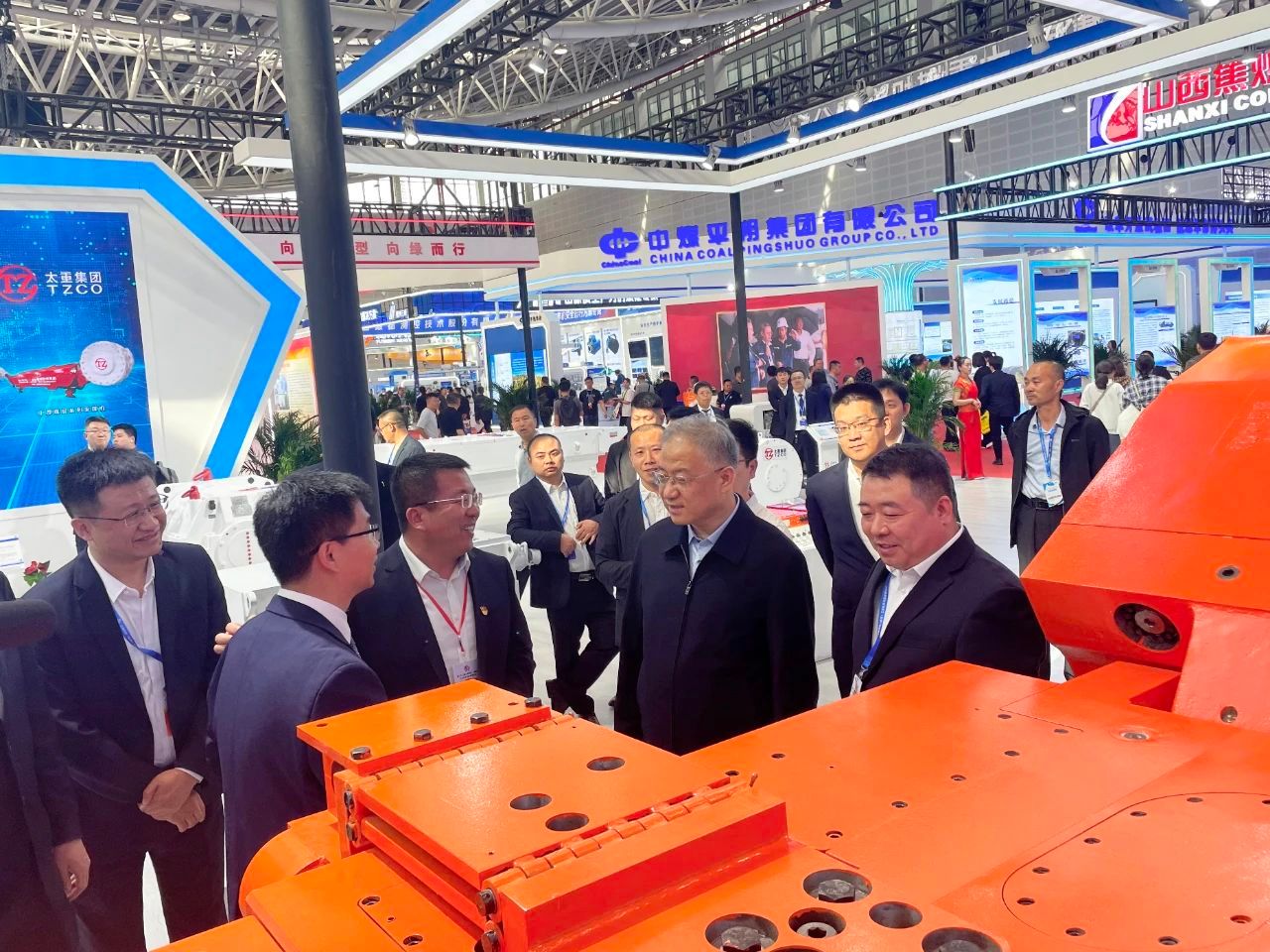 这次展览以“智能引领、绿色发展”为主题,集中展示煤炭采掘和能源工业节能减排、智慧矿山、5G应用、煤层气开发与利用等各类高新技术成果和智能高端装备,是全国煤炭行业规模最大的区域性品牌展会,在国内外煤炭领域具有重要的影响力。在太重煤机展区,韩珍堂依次参观了展区各个产品,对太重煤机参加展会的各项筹备工作给予肯定。当走到展示的1410kW系列低机面高功率密度采煤机身旁时,该机型主任设计师向韩珍堂董事长介绍说,这台采煤机采用高强度合金材料钢,机身矮、功率密度高、破岩能力强、过煤空间大、装煤效果好,主要满足较薄煤层高效智能开采的需求,已在多家煤矿成功应用。太重煤机也是国内唯一同时掌握“框架式结构”和“三段式结构”技术的采煤机制造商,现已拥有功率391kW至3000kW、采高1.3m至8m的12大系列112种机型。
